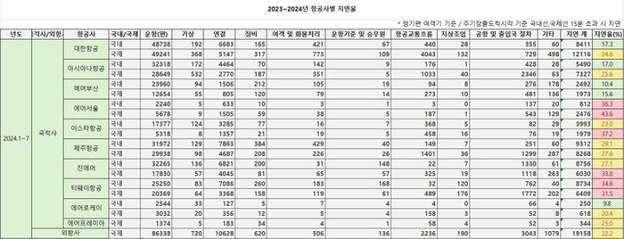 국회 국토교통위원회 소속 안태준 더불어민주당 의원실이 국토교통부를 통해 확보한 ‘최근 5년간 항공기 지연현황(항공사별)’에 따르면 올해 1월부터 7월까지 항공기 지연은 총 11만4948대로 전체 운항편수(47만7085대)의 24.1%를 차지했다.
