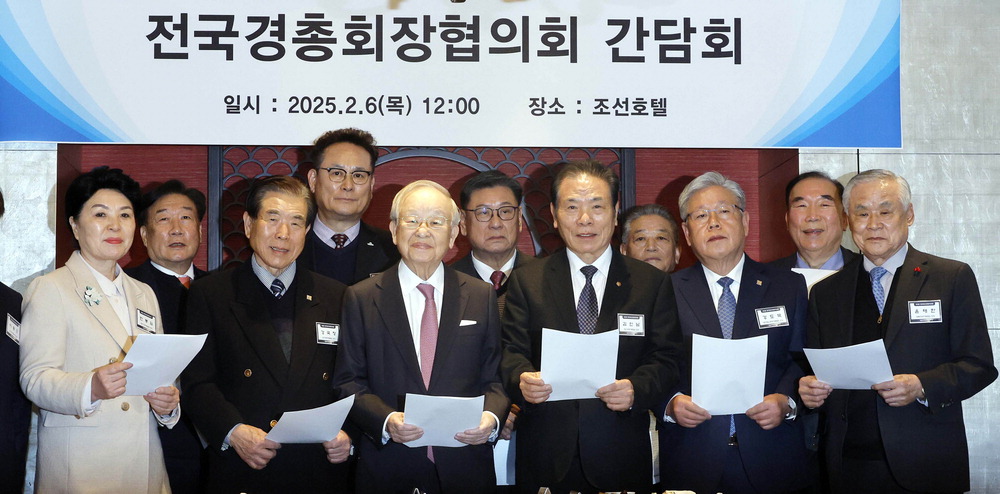 한국경영자총협회와 15개 지방경총 회장으로 구성된 전국경총회장협의회가 6일 서울 웨스틴 조선호텔에서 간담회를 개최하고 '경제 회복과 사회 통합을 위한 호소문'을 발표했다. 협의회는 "경제의 재도약을 위해 정치권,노동계,기업 등 모든 주체가 역량을 결집해야 한다"며 "기업 활력 제고와 민생 안정을 위한 입법에 매진해줄 것을 정치권에 당부한다"고 밝혔다. 왼쪽부터 한봉심 제주경총 회장,박승대 경북동부경총 회장,강국창 인천경총 회장,김춘호 경기경총 회장,손경식 한국경총 회장,유기석 울산양산경총 회장,김인남 대구경총 회장,박동언 강원경총 회장,강도묵 대전충남경총 회장,김광수 부산경총 회장,윤태한 충북경총 회장. 김호영 기자