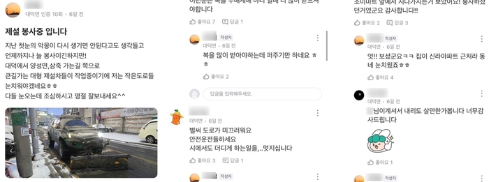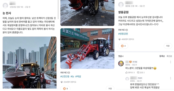 이 외에도 본인이 직접 눈을 치우지는 못했지만 이웃의 선행을 발견해 널리 알리고자 하는 게시글도 다수 올라왔다. 경기도 오산시에서는 ‘눈 천사’라는 제목과 함께 “낯선 트랙터가 깃발을 날리며 동네 눈을 치우고 있어 알아보니 자비로 봉사하시는 분이었다”며 동네 일상을 공유했다.