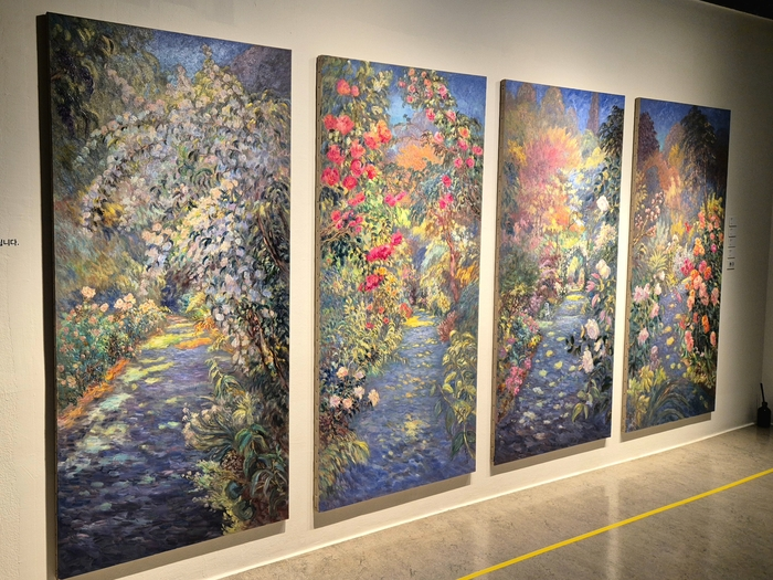 이자벨 드 가네의 ‘지베르니’ 연작. [서나은 인턴기자] 수련 작품을 지나치자 눈앞에 거대한 네 개의 캔버스가 나타났습니다. 바로 ‘지베르니’ 연작입니다. 계절과 시간에 따라 달라지는 자연을 담은 이 작품은 이자벨이 한국 관객을 위해 특별히 준비한 작품이라고 합니다. 아름다운 선물을 받은 듯한 기분을 만끽할 수 있습니다.