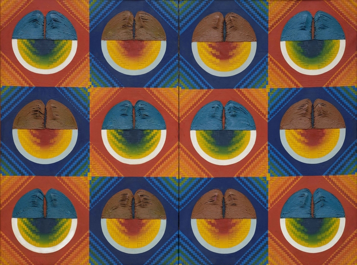 하종현의 ‘탄생-B’(1967) <국제 갤러리,티나킴 갤러리> 1935년생인 하종현 작가는 한국전쟁 등 격동의 시대를 거치며 독창적인 작업 방식을 발전시켜 왔다. 전후 한국에서 쌀 운송에 쓰이던 산업용 마대를 캔버스로 활용하는 등 일상적 소재를 예술로 끌어들였다. 1960년대에는 화면에 물감을 올리고 실을 붙이거나 불로 그을리는 등의 앵포르멜 작업을 시도했다. 이후 급격한 산업화의 흐름 속에서 도시 인프라를 대담한 격자와 방사형 선으로 표현하기도 했다.