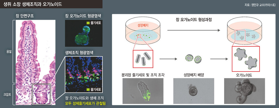 장 오가노이드는 짧은 오가노이드 기술의 역사에서 가장 긴 편에 속한다. 장 표면의 상피세포는 끊임없이 재생하고 장 안쪽의 표면적을 넓히기 위해 구불구불한 돌기들을 만들어낸다. 장 상피를 재생하기 위한 성체줄기세포가 많이 있기 때문에, 사람이나 실험동물로부터 채취한 장 조각을 배양기에서 키우면, 성게 모양의 독특한 3차원 구조체가 만들어지는 것은 비교적 쉽게 관찰할 수 있다. 장 오가노이드는 그 장기를 구성하는 세포들이 장기의 독특한 모양을 형성하는 3차원 구조체다. 그 모양이 독특하다는 점은 연구자가 쉽게 성공 여부를 판정할 수도 있고 모양이 주는 아름다움은 관심을 끌기에도 충분하다. 이 ‘예쁜’ 장 오가노이드가 오가노이드 기술 개발에 끼친 영향은 절대적이었다.