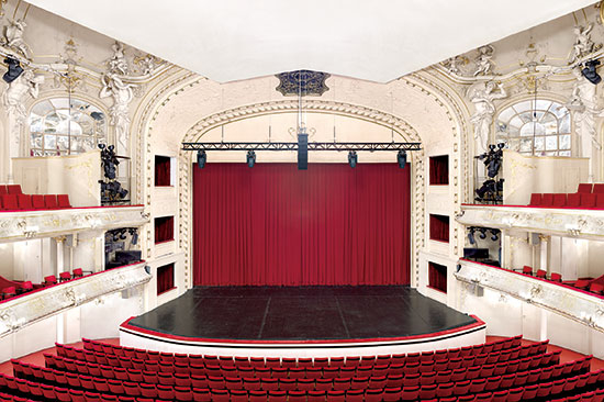 카르나발레 박물관의 복원된 벽화에서 ‘붉은 장막’이라는 시각적 요소로 강조되는 장식적이고도 연극적인 분위기는 베를린의 코미셰 오페라(Komische Oper Berlin)의 텅 빈 무대와 관객석을 담은 또 다른 연작과 연결된다. 코미셰 오페라의 원형이 되는 19세기 후반의 건축물은 2차 세계대전 공습으로 심각한 손상을 입었고,이후 1960년대에 재건축,1980년대에 다시 복원 과정을 거쳤다. 현재까지는 리허설과 백스테이지 공간으로 리노베이션이 진행 중인데,회퍼는 2022년도에 이 장소를 방문해 촬영했다.