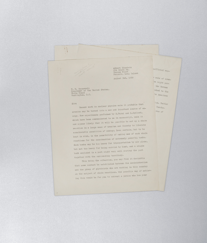 이 서신은 루스벨트 대통령에게 독일군이 파괴적인 무기의 연료로 사용할 수 있는 핵분열이 가능한 형태의 우라늄을 발견했다는 사실을 알렸다. ‘맨해튼 프로젝트’를 탄생시켜 20세기에 쓰인 가장 영향력 있는 서한으로 꼽힌다.