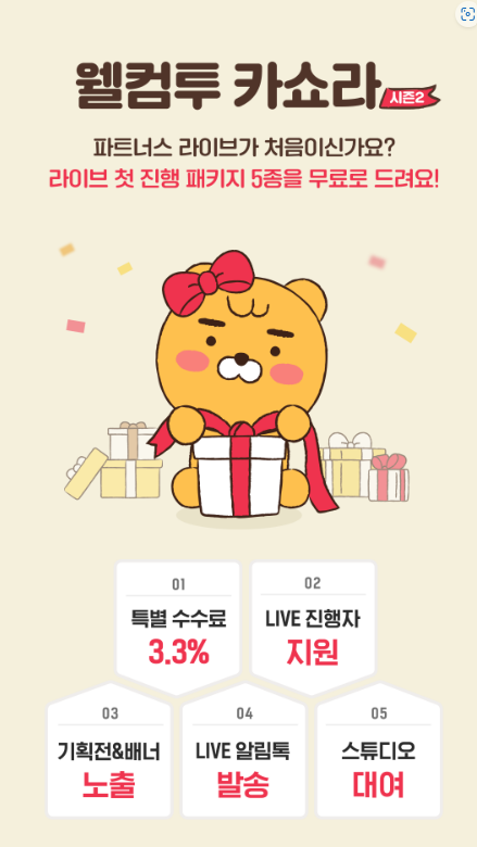 카카오는 올해 초부터 ‘웰컴투 카쇼라 시즌2’를 진행하면서 라이브 첫 진행 패키지 5종을 무료로 제공 중이다. 라이브를 처음으로 진행하는 업체에 기존 7.7% 수수료율을 3.3%까지 낮춘 특별 수수료를 적용하고 라이브 전문 쇼호스트 아카데미와 연계해 상품에 적합한 진행자를 무료 지원한다. 또한 카카오톡 라이브홈,쇼핑탭 등에 노출해주고 라이브 시작 알림톡 무료 발송,라이브 스튜디오 대여도 해준다.