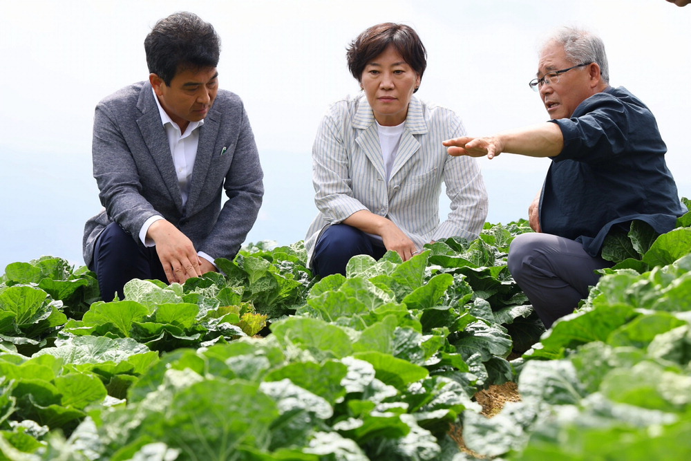송미령 농림축산식품부 장관(가운데)이 8일 강릉시 고랭지 배추밭에서 배추 생육 상황을 점검하고 있다. 이날 송 장관은 "배추 가격 안정을 위해 비축 물량을 다양한 방법으로 적시에 적량을 공급해달라"며 관계 기관에 요청했다. 농림축산식품부