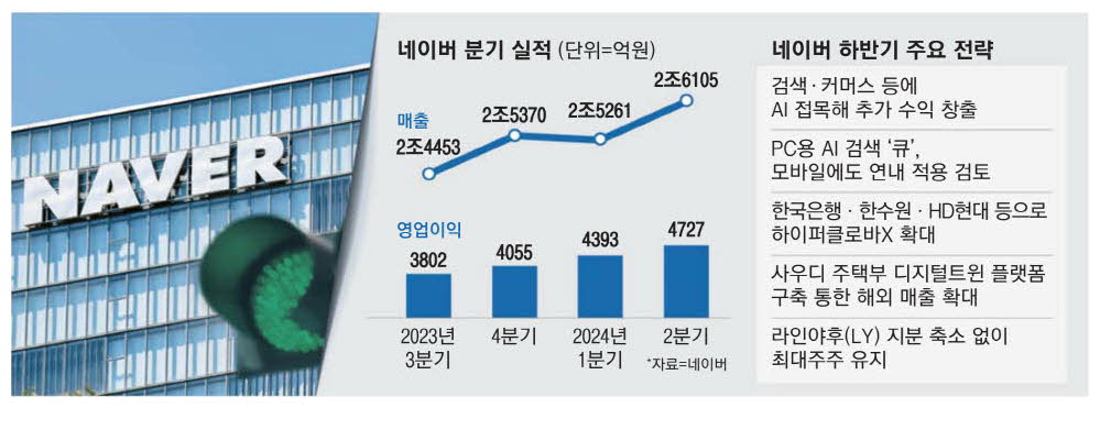 라인야후(LY) 사태 등 대외 리스크 속에서도 네이버가 올해 2분기 역대 최대 실적을 기록했다. 핵심 사업 영역인 서치플랫폼,커머스,핀테크 등이 모두 전년 동기 대비 5% 이상 성장하며 실적을 견인했다.
