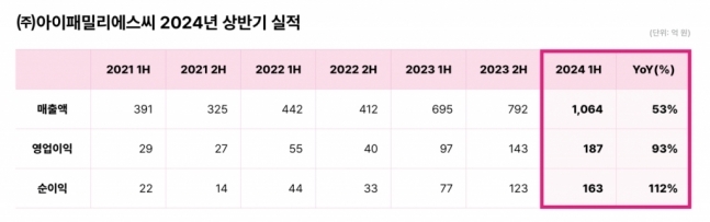 아이패밀리에스씨는 상반기 매출액 1064억원,영업이익 187억원,순이익 163억원을 기록했다고 9일 공시했다. 전년대비 각각 53%,93%,112% 증가한 것으로,올해 연 매출이 창사 이래 최대일 것으로 회사는 기대하고 있다.