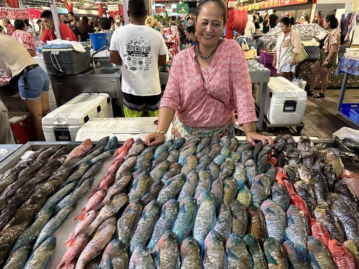 일요일마다 열리는 수산물 시장. /사진= 강예신 여행+ 기자 수산시장은 시장 안쪽 가운데에 넓게 자리한다. 우리나라에서 보지 못하던 알록달록한 생선들이 가득하다. 갈로팽 셰프에 따르면 이 형형색색 생선들은 산이 많은 타히티섬에서 잡힌 것들만의 특징으로,다른 섬에서 온 생선들은 색이 화려하지 않다고 한다.