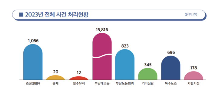 20일 ‘2023 노동위원회 통계연보’에 따르면 지난해 노동위는 총 1만8946건의 사건을 처리했다. 이중 지방노동위(초심)에서 1만6561건을,중앙노동위(재심)에서 2385건을 처리했다. 전체 처리사건 중 ‘부당해고 등’ 사건이 1만5816건으로 83.5%를 차지했다. 이외 △부당노동행위 823건 △복수노조 696건 △차별시정 178건 △기타심판 345건을 처리했다.