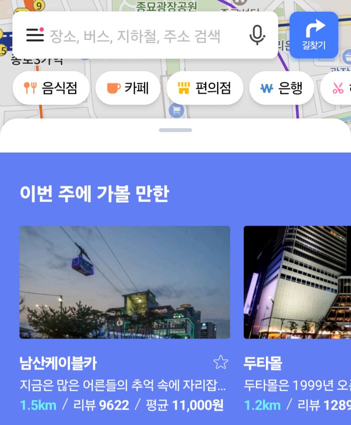[사진 = 네이버지도 애플리케이션 갈무리] 네이버는 지난해부터 플레이스·지도 정보를 끌어와 인기 있는 장소와 방문자 리뷰를 기반으로 한 AI 장소 추천 시스템을 내놨다. 단순 상호 노출에 그치지 않고 주문과 예약까지 가능한 초개인화 맞춤형 정보를 제공하고 있다. 시중은행 영업점의 대기 번호표 발급도 모바일로 가능하다. 또 특정 장소에 도달하기 위한 교통수단 및 이동 시간을 알려 주는 데에서 나아가 지하철 역사 내 환승 경로와 승강기 위치까지 확인할 수 있게 됐다.