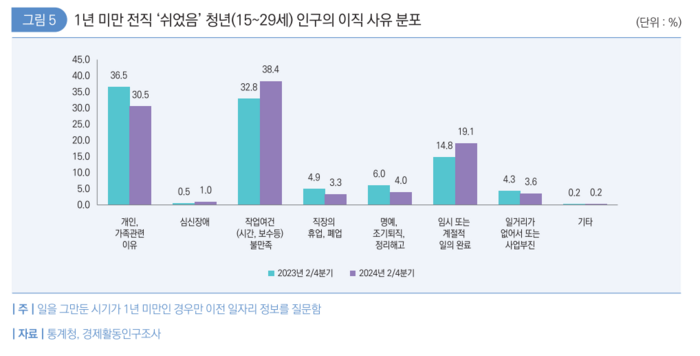 또 분석 결과 청년 쉬었음 인구 중 1년 이내 이직자 4명중 1명은 숙박·음식점업,제조업,도매·소매업에서 임시 일용직으로 일했다. 윤 연구원은 “지난 2분기 증가는 숙박·음식점업에서 임시 일용직으로 일한 20대 후반 남성이 주도했다”고 분석했다.