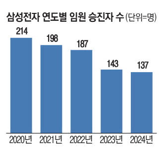 29일 삼성전자는 부사장 35명,상무 92명,마스터 10명 등 총 137명을 승진시키는 2025년 정기 임원 인사를 실시했다. 작년(143명)보다 인사 규모는 소폭 줄었다. 부사장 승진자 수는 작년보다 30% 감소했다. 특히 반도체 시장이 호황이었던 2017년 대비 전체 임원 승진 규모는 40% 쪼그라들었다. 임원 조직을 슬림화하며 경기 침체와 글로벌 경제 불확실성에 대응하기 위한 경영 효율화 작업을 가속화하려는 의도로 풀이된다.