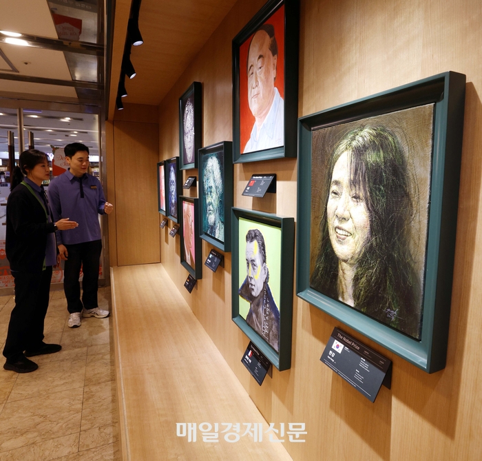 [포토] 한강 노벨문학상 수상자의 초상화 걸린 교보문고