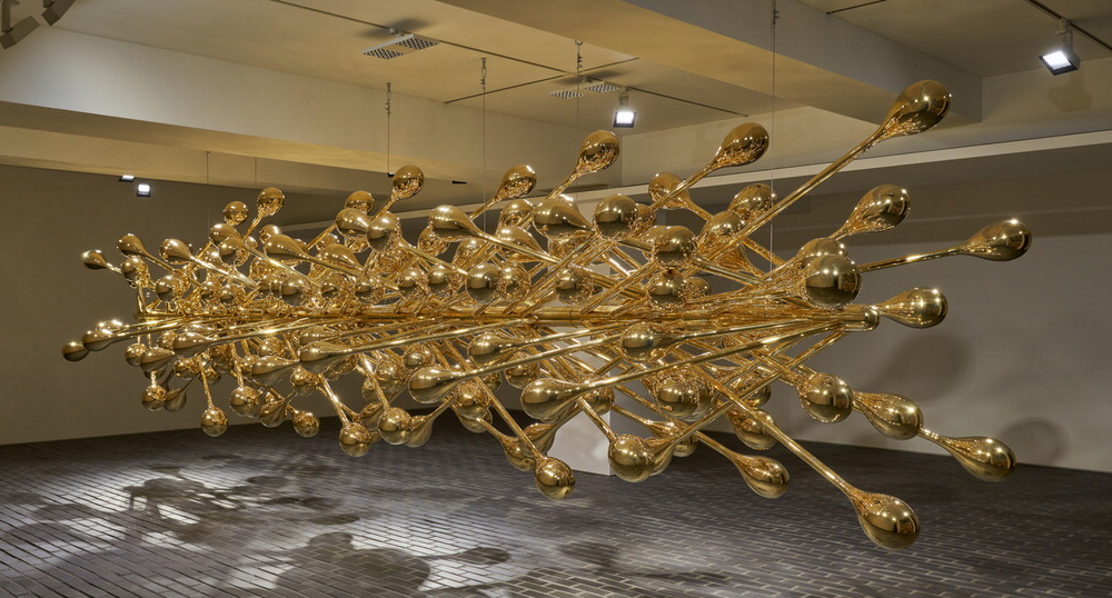 이번 전시의 대표작 '수평 정원'이 바로 그렇다. 가로 7m에 달하는 직선의 황금빛 청동을 가운데 두고 수십,수백 개 가지 끝에 타원의 구(球)가 각각 달려 있다.