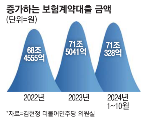 보험계약대출 잔액은 2022년 말 기준 68조4555억원에서 2023년 말 71조5041억원으로 확 늘었다. 그러다가 작년 1분기 말과 2분기 말엔 각각 70조1000억원,70조2000억원을 기록하며 주춤했지만 작년 3분기에 다시 1조원 가까이 증가하며 71조원을 재차 돌파했다. 이어 4분기에도 보험계약대출은 계속 늘고 있는 추세라 연말 기준으로는 역대 최대치를 경신할 것으로 예상된다.