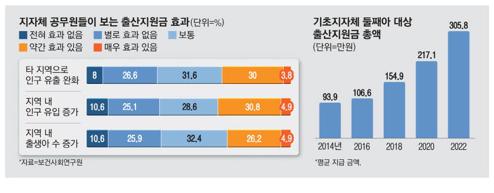 전국 시도,시군구 출산지원금 정책을 실시하고 있는 공무원 263명을 대상으로 한 설문조사에서도 31.1%만이 출산장려금 사업이 지역 내 출생아 수 증가에 효과가 있다고 답했다. 다른 지역으로 인구 유출을 완화하는 데는 응답자 중 33.8%가 효과가 있다고 답했으며,지역 내 인구 유입을 증가시키는 데 효과가 있다고 답한 비중은 35.7%에 불과했다.
