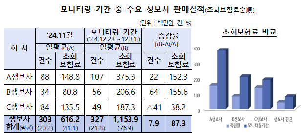 모니터링 기간에 일평균 계약체결 건수는 327건으로 전월대비 7.9% 상승하는데 그쳤으나 초회보험료는 11억5390만원으로 전월대비 87.3% 급등했다. 즉 고액 건 위주로 판매를 확대한 것으로 금감원은 보고 있다.