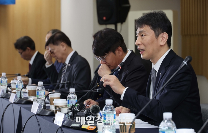 이복현 금융감독원장이 27일 서울 종로구 생명보험교육문화센터에서 열린 보험회사 최고경영자(CEO) 간담회에서 발언하고 있다. [한주형기자] 이복현 금융감독원장이 보험사가 무리한 상품 경쟁으로 소비자에게 피해를 입힐 경우 엄중히 책임을 묻겠다고 강조했다. 삼성생명의 삼성화재 자회사 편입 승인 신청과 관련해선 지배구조상 변화는 없다고 밝혔다.