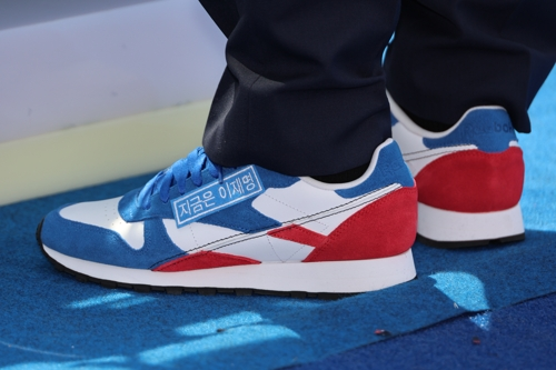 13일 유통업계에 따르면 이 후보가 전일 출정식 단상에 올라 직접 신발을 갈아신으며 ‘통합’을 강조한 운동화는 미국 스포츠의류 브랜드 리복의 ‘클래식 레더 GY1522 모델이다. 리복의 벡터 로고를 강조해 하얀 운동화 바탕에 파란색과 빨간색이 조화를 이룬다.
