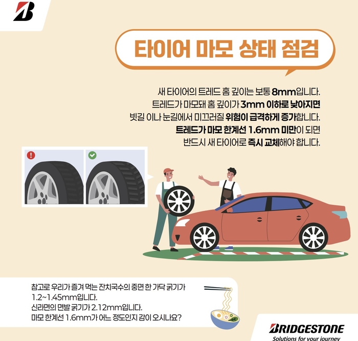 [사진제공=브리지스톤] 브리지스톤의 국내법인 브리지스톤 타이어 세일즈 코리아(대표이사 김헌영,www.bridgestone-korea.co.kr,이하 브리지스톤)이 여름 장마철 안전 운전을 위한 타이어 점검법을 25일 소개했다.