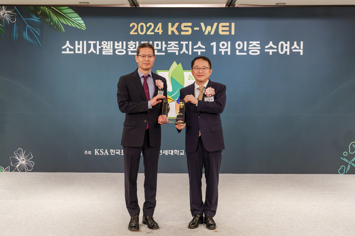 지난달 28일 곽재환 예다함 대표이사(왼쪽)가 강명수 한국표준협회 회장으로부터 인증패를 수여받은 후 기념촬영을 하고 있다.[사진 제공 = 예다함] 한국표준협회(KSA)가 주관하는 ‘2024 소비자웰빙환경만족지수(KS-WEI)’ 장례서비스 부문에서 더케이(The-K)예다함상조(예다함)가 9년 연속 1위에 선정됐다.