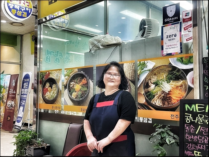 전주콩나물국밥 종로점의 홍승혜 사장이 테이블오더기에 대해 설명하고 있다. <부자비즈> 견디다 못해 홍승혜 사장은 테이블오더기 도입을 결정했다. 마침 매장을 자주 찾던 단골 고객이 힘들어 하는 홍승혜 사장의 사정을 알고 중소벤처기업부와 소상공인시장진흥공단이 추진하는 ‘스마트상점 기술보급사업’을 알려주며 국비 지원을 받아보라고 정보를 준 것이다.