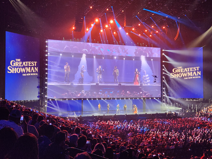 9일(현지시간) 미국 캘리포니아주 애너하임 혼다센터에서 열린 D23 ‘디즈니 엔터테인먼트 쇼케이스’ 행사에서 뮤지컬 배우들이 ‘위대한 쇼맨’의 주제곡을 부르고 있다. <사진=이덕주 기자> 2017년 국내에 개봉된 후 누적 관객수 173만명을 기록한 뮤지컬 영화 ‘위대한 쇼맨’이 스테이지 뮤지컬로 제작된다.