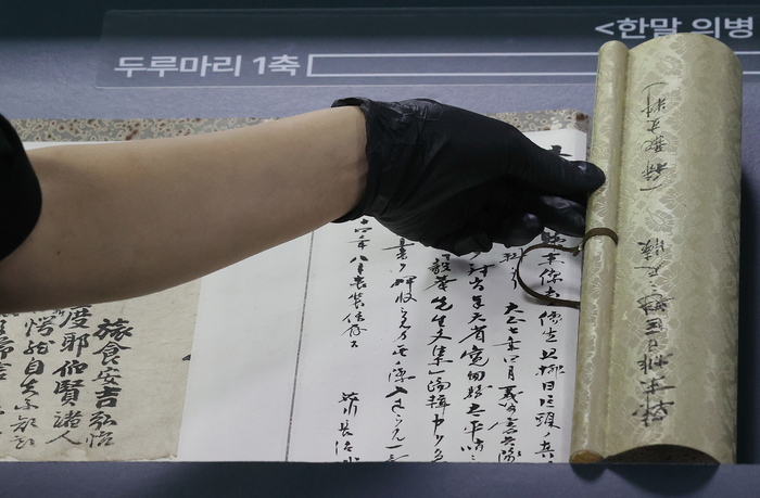 14일 오전 서울 종로구 국립고궁박물관에서 열린 환수 문화유산 공개 행사에서 관계자가 ‘한말 의병 관련 문서’ 두루마리의 제목 부분을 공개하고 있다. 이 두루마리에는 ‘한말배일거괴지척독’(한말 일본을 배척한 우두머리의 편지)라는 일제가 쓴 제목이 적혀 있다. <연합뉴스> “제 동생이 붙잡힌 뒤에 의병 각 군진이 실망하여 기강이 해이해질까 염려됩니다. 더욱 분한 마음으로 독려하고 한 마음으로 협력해 대사를 함께 도모해야 합니다. 서로 사랑하고 서로 보호하기를 전보다 배가한 연후에야 국권을 회복하고 생령을 보전하며,강토를 온전히 할 수 있을 것입니다. 원통하고 분합니다.”