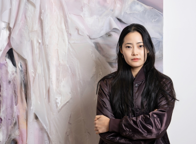 아침 김조은의 ‘Next Time’ [글래드스톤] 한국 작가 아침(미국 활동명) 김조은(35)이 세계적 화랑 글래드스톤 서울에서 개인전 ‘최소 침습’을 열며 금의환향했다. 경희대 미대 2학년을 마치고 미국으로 유학을 떠난 작가의 첫 국내 전시다. 뉴욕대·컬럼비아대에서 학·석사를 마치고 뉴욕을 기반으로 설치,회화 등의 작업을 해온 작가는 전통 소재인 비단에 동양화를 연상시키는 독특한 화법으로 여성들의 인물화를 그리며 뉴욕에서 ‘깜짝 스타’가 됐다.