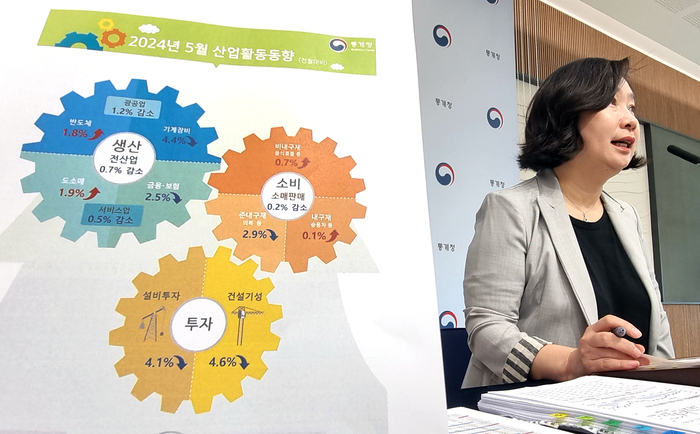 통계청 공미숙 경제동향통계심의관이 28일 오전 정부세종청사에서 2024년 5월 산업활동 동향에 관해 설명하고 있다. 2024.6.28 [사진 = 연합뉴스] 경기도 안성에서 삼겹살집을 운영하는 김 모씨는 매달 뚝뚝 떨어지는 매출에 울상이다. 김 씨는 “고깃값도 올랐을 뿐더러 인건비까지 급격히 상승했는데 매출은 줄어들어 도저히 손익분기점을 맞출 수가 없다”고 푸념했다. 대출이라도 받고 싶지만 언감생심이다. 김 씨는 “금리가 높아 더 이상 대출을 받을 형편도 안 돼 장사를 접어야 하나 고민 중”이라고 했다.