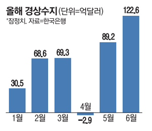 경상수지를 월별로 보면 1월엔 30억5000만달러 흑자였다가 2월엔 68억6000만달러,3월 69억3000만달러로 흑자 규모가 확대됐다. 4월에는 2억9000만달러 적자로 돌아섰지만 5월 89억2000만달러 흑자를 기록하면서 다시 흑자로 바뀐 데 이어 6월에는 122억6000만달러로 흑자가 대폭 커졌다.