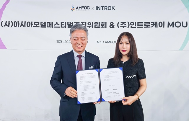 AMFOC 양의식 회장(왼쪽)과 인트로케이 크리스틴 박 대표가 MOU를 체결했다. 제공|AMFOC (사)아시아모델페스티벌조직위원회(회장 양의식· AMFOC)와 ㈜인트로케이(대표 크리스틴 박)가 27일 상호협력을 위한 업무협약(MOU)을 체결했다.
