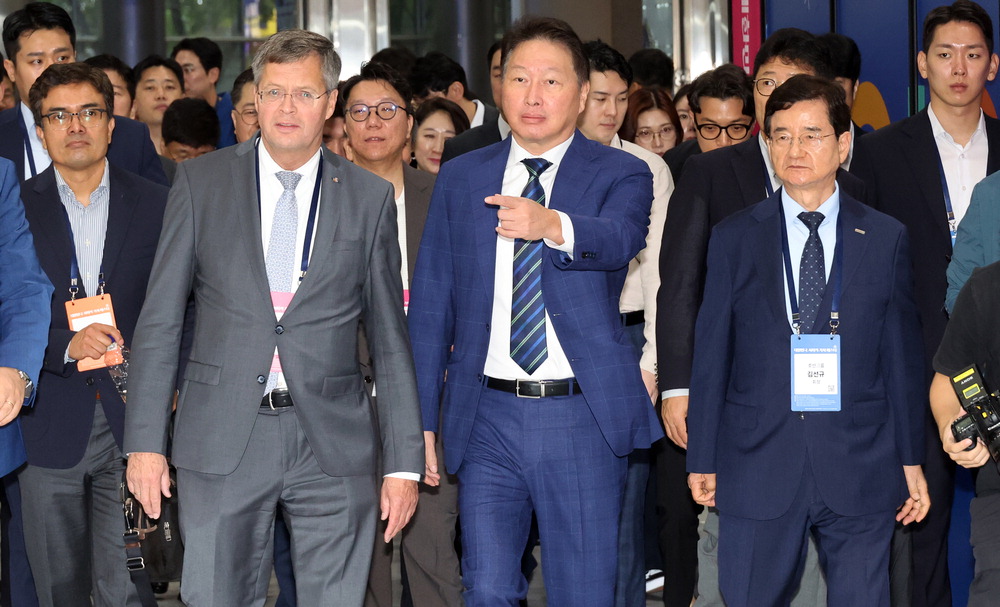 최태원 대한상공회의소 회장(앞줄 가운데)과 얀 페터르 발케넨더 전 네덜란드 총리가 12일 서울 코엑스에서 열린 '제1회 대한민국 사회적 가치 페스타' 전시장을 둘러보고 있다. 대한상공회의소