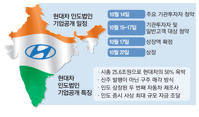 현대차는 인도법인 상장을 위해 인도법인 주식 14억2194만7000주(전체 인도법인 발행 주식의 17.5%)를 매각하기로 결정했다. 현대차 인도법인이 상장한 후 시가 총액은 190억달러(약 25조6000억원)로 예상된다. 이 경우 현대차는 지분 17.5%를 매각한 금액 33억달러(약 4조5000억원)를 확보할 것으로 전망된다. 이 금액에 대해선 그룹 차원에서 다양한 분야에 투자할 계획을 세우고 있는 것으로 알려졌다. 글로벌 기관투자자들에 배정하고 남은 주식 약 10억주는 15일부터 17일까지 추가적으로 기타 기관투자자와 개인투자자 등에게 배정된다.