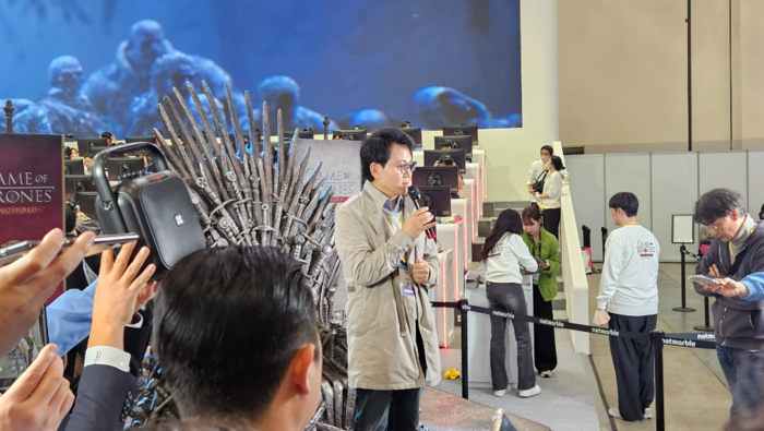 방준혁 넷마블 의장이 지난 14일 오후 부산 벡스코에서 열린 지스타에 참석해 기자간담회를 열고 질의응답을 하고 있다. [이가람 기자] 우리나라 최대 게임 행사인 ‘지스타(G-STAR)’가 성황리에 진행되고 있는 가운데,게임회사 최고경영자(CEO)들도 행사장으로 총출동해 전시관을 둘러보고 방문객을 맞이했다.