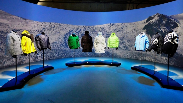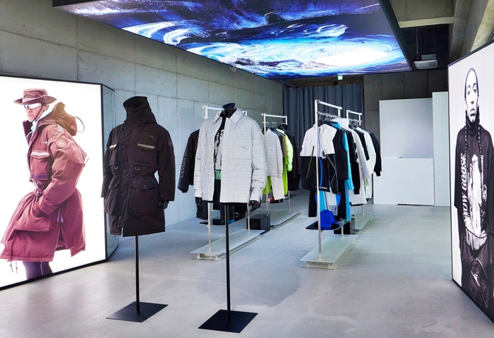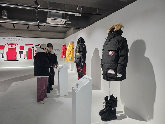 오는 15일까지 4일동안 서울 성수동 연무장길에서 ‘스노우구스 바이 캐나다구스’ 팝업 스토어 내부. 아시아 최초로 선보이는 캡슐 컬렉션이 1층에 전시되어 있다. ‘스노우구스 바이 캐나다구스’로 명명된 이번 캡슐 컬렉션은 약 70년 간의 브랜드 헤리티지와 장인 정신을 보여주는 동시에 하이더 아커만의 미학을 담은 혁신적인 디자인과 역동적인 실루엣,대담한 색상으로 새로운 캐나다구스를 표현했다.