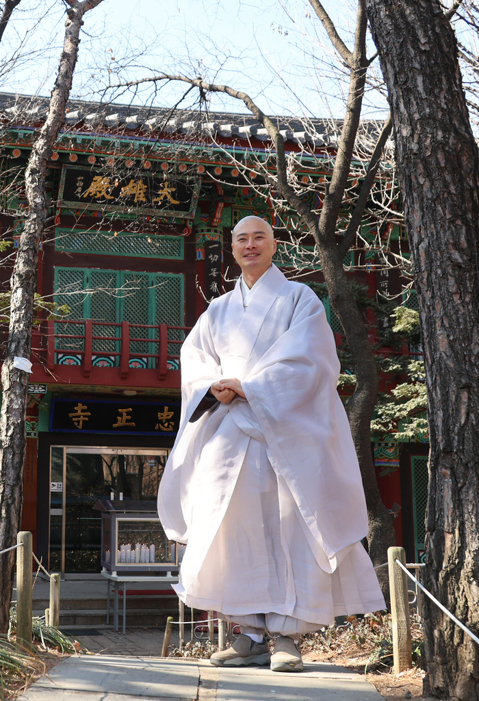 남산 충정사 새 주지로 부임한 덕운 스님이 충정사 입구 앞에서 포즈를 취하고 있다. 2025.02.23.. [이승환기자]