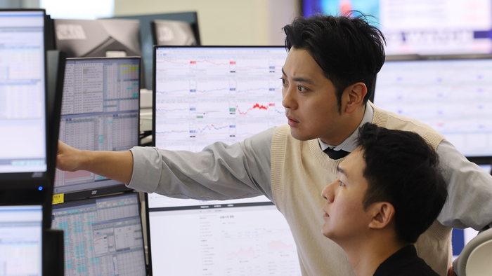 7일 서울 중구 하나은행 본점 딜링룸에서 직원들이 업무를 보고 있다. [사진 = 뉴스1] 미국 도널드 트럼프 대통령의 관세 유예 발표 영향 등으로 10일 장초반 코스피200선물 지수가 6%가까이 급등하며 매수 사이드카가 발동됐다.