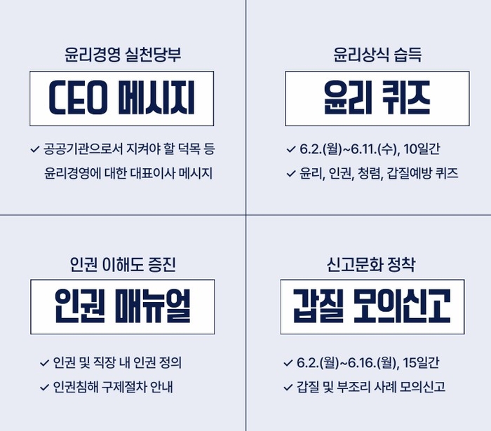 박 대표는 메시지를 통해 “청렴한 조직이 곧 국민의 신뢰로 이어진다”고 강조하며,윤리경영의 중요성과 실천 필요성을 당부할 계획이다.
