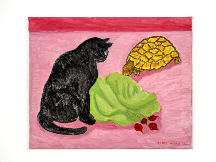 마치 에이버리의 ‘Turnips’(2020) <에스더쉬퍼> 집 안인 사적 공간을 그릴 때 작가의 시선은 더욱 다정해진다. 화려한 정물 대신 식탁 위에 무심하게 놓인 채소를 주목하고,평생을 함께해온 반려묘와 거북이의 평화로운 일상을 응시한다.