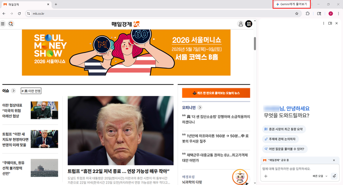 기자도 새로워진 크롬을 이용해 봤다. 매일경제 홈페이지에서 기사를 읽다가 제미나이 채팅창에 ‘미국과 이란의 전쟁 타임라인 알려 줘’라고 질문했더니,‘미국과 이란 사이의 갈등은 전면적인 군사 충돌과 긴박한 협상이 교차하는 긴박한 상황’이라며 전쟁의 시작부터 확전을 거쳐서 휴전에 이르기까지 굵직한 사건을 날짜별로 정리해 줬다. 제미나이가 기자의 브라우저 이용 상황을 실시간으로 확인 중인지 매일경제에서 관련 기사를 찾아 주겠다고 제안하기도 했다.