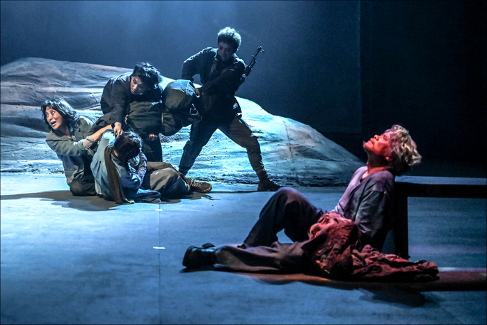 망자의 한(恨)과 살아남은 자의 고통을 그린 서울시극단 연극 ‘연안지대’의 한 장면 ‘연안지대’는 살아남은 자의 고통을 감각적으로 드러낸다. 윌프리드는 작품 내내 천으로 감긴 이스마일의 시신을 양손으로 든 채 여정을 이어간다. 산 자가 짊어지는 죽은 자의 고통을 시각화한 것으로 읽힌다. 윌프리드는 “너무 무거워. 죽을 것 같아” “더 이상 못 가겠어”라고 부담을 호소하면서도 시신을 내려놓지 않는다. 윌프레드와 함께하는 시몬(윤현길),아메(이미숙),사베(공지수),마시(정연주) 등이 품은 상처들도 무대 위 바위산을 중심으로 총소리,포격 소리 등과 함께 펼쳐진다.