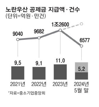 반도체를 중심으로 수출 회복세가 이어지고 있지만 영세 중소기업까진 온기가 퍼지지 못하면서 체감경기는 여전히 바닥이다. 실제로 중소기업중앙회에 따르면 소기업·소상공인들의 폐업 공제금인 노란우산 공제금 지급액은 지난해 각각 1조2600억원과 11만건으로 역대 최대치를 기록했다. 올해 1월부터 5월까지의 집계액도 전년 동기보다 높아 추세대로라면 올해도 사상 최대치를 경신할 것으로 보인다. 내수가 얼어붙은 상황이 이어지는 데다 고금리·고물가·고임금 등의 악재도 여전하기 때문이다.