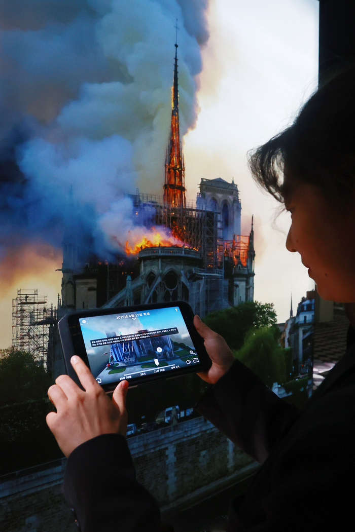 1일 서울 종로구 국립고궁박물관에서 열린 디지털 전시 ‘파리 노트르담 대성당 증강현실 특별전: 내 손으로 만나는 860년의 역사’ 개막 언론간담회에서 참석자가 전시를 체험하고 있다. <연합뉴스> “첨탑이 무너졌다.”