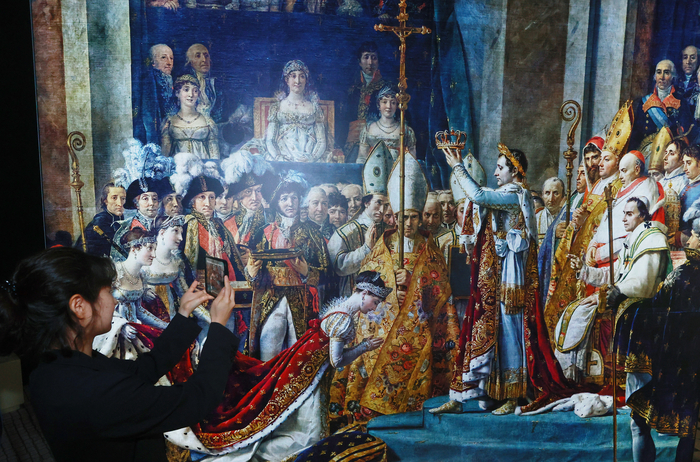 삼성 ‘갤럭시 탭 액티브5’를 전시장 22곳 단상에 설치된 화면 ‘시간의 문’에 대면 주요 역사적 순간으로 시간여행을 떠나는 구조다. 시작점은 대형화재가 발생했던 2019년이다. 갤럭시 탭에서 구현된 화면은 최초 화재 신고 지점과 확대 과정,파리 소방대 출동 지점,훼손된 구조물과 예술품 등을 시간대별로 세세하게 보여준다. 그리고는 1160년대 성당을 짓게 된 계기와 건축 과정,스테인드글라스의 세세한 문양과 의미를 짚는다. 하이라이트는 1804년 나폴레옹 1세의 대관식이다. 루브르 박물관에 소장된 자크 루이 다비드의 대형 그림 복사본 앞에 갤럭시 탭을 대면 당시 대관식 장면이 360도 파노라마처럼 펼쳐진다. 평면 그림에 다 담지 못한 입체적인 천장과 회랑,관중석의 장면까지 사실적으로 복원했다.