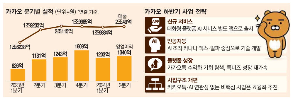 비핵심 사업을 솎아내고 미래 수익성에 도움이 되는 AI 등 핵심 사업에 전사적 역량과 자원을 집중 투입해 중장기 성장 동력을 마련하겠다는 구상으로 풀이된다. 카카오는 당장 올 하반기에 일반 소비자를 겨냥한 대화형 플랫폼 형식 AI 서비스를 기존 카카오톡과 별도의 애플리케이션(앱) 형태로 출시한다는 계획이다.