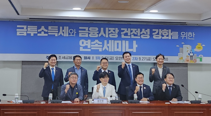 더불어민주당과 조국혁신당 의원들이 13일 국회에서 열린 ‘금투소득세와 금융시장 건전성 강화를 위한 연속세미나’에 참석해 포즈를 취하고 있다. [사진=위지혜 기자] 더불어민주당이 오는 24일 금융투자소득세 정책 토론회를 앞두고 사전 의견조율에 본격 착수했다. 그간 침묵을 지키고 있던 당내 ‘유예론자’들의 입장 표명이 이어지자 ‘시행론자’들도 세력을 규합하는 모양새다.
