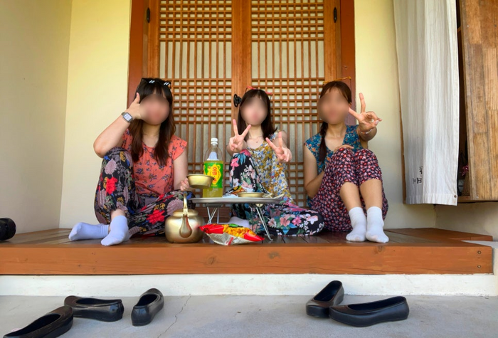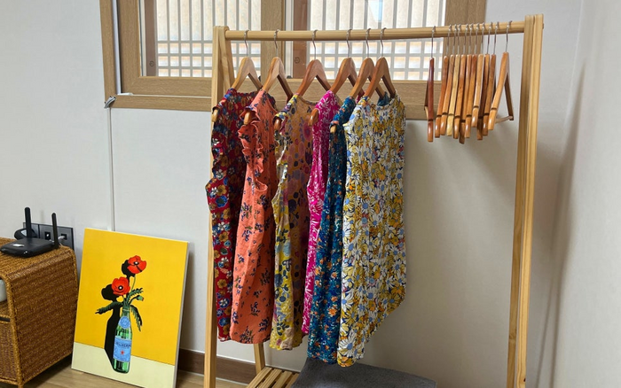 춘스테이에 있는 꽃무늬 민소매 / 사진=정세윤 여행+ 기자 꽃무늬 민소매를 입고 그늘진 툇마루에 앉았다. 아무 생각 없이 살랑살랑 불어오는 바람을 맞고 있으니 마음이 편안해졌다. 조금 휴식을 취한 뒤 촌캉스의 하이라이트라고도 할 수 있는 콘셉트 사진을 남겼다. 툇마루 한편에 놓여 있는 양은 밥상을 펼쳐 막걸리 주전자까지 세팅하니 요즘 SNS에 흔히 올라오는 촌캉스 인증샷을 완성했다. 툇마루 앞에 고무신까지 놓아주면 더 완벽하다.