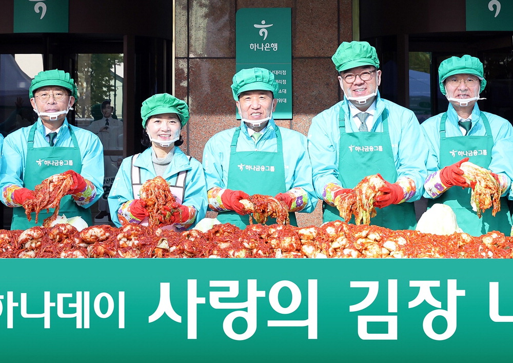 하나금융그룹이 11일 임직원들이 다양한 봉사활동에 참여하는 '2024 모두하나데이' 선포식을 열었다. 함영주 하나금융 회장(왼쪽 셋째)과 그룹 경영진은 김장을 담그는 행사를 진행했다. 이날 함 회장은 청각장애인이 운전하는 고요한M택시를 타고 서울 중구에 있는 아동보육시설인 남산원을 방문해 김치와 간식을 전달했다. 하나금융그룹